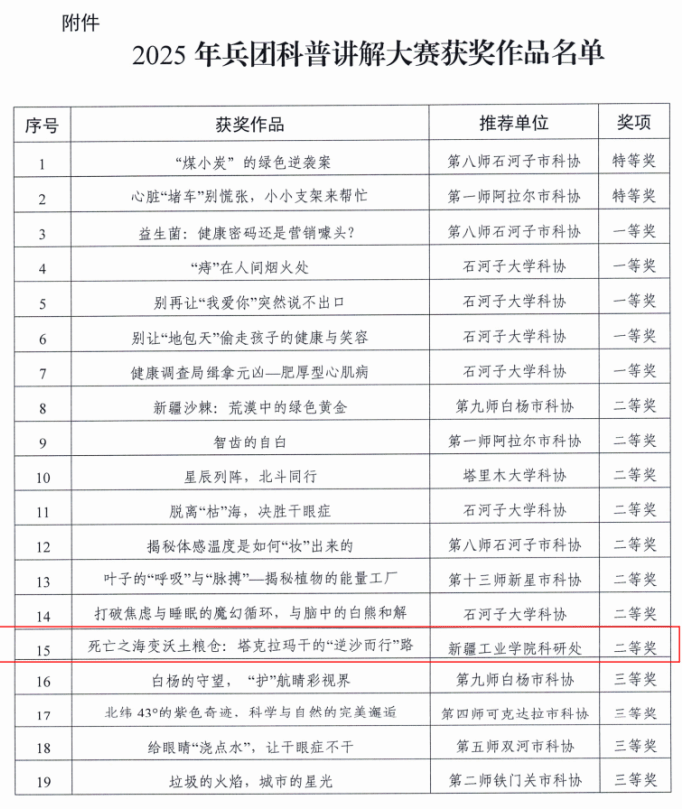 近日,兵团科学技术协会公布了2025年兵团科普讲解大赛的获奖名单。作为一所新建高校,beat365首次组织参与该项兵团级科普赛事,凭借扎实的内容设计与创新的展示形式,成功斩获一项二等奖及两项优秀奖,实现了学校在兵团级科普赛事中获奖“零的突破”,为beat365科普工作持续发展奠定了良好基础。