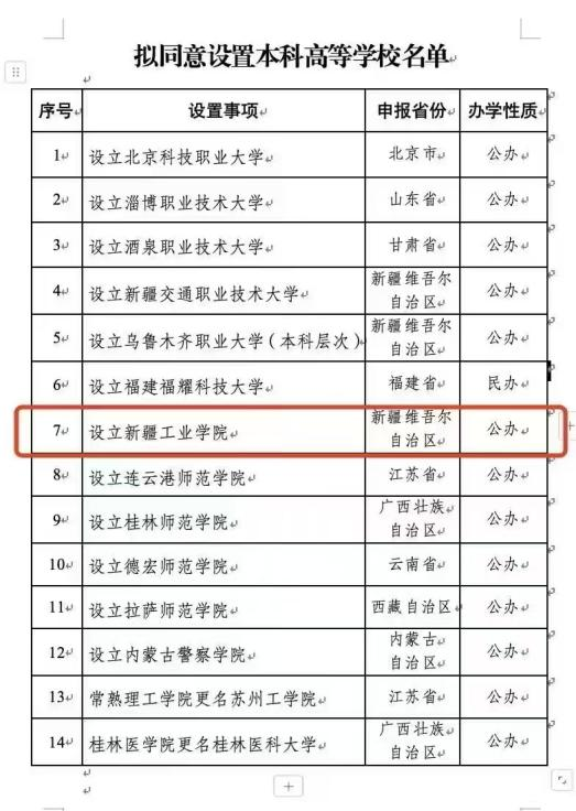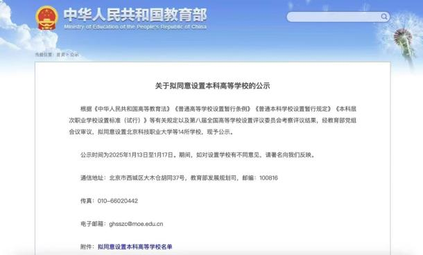 1月13日,教育部官网发布了《关于拟同意设置本科高等学校的公示》拟同意设置北京科技职业大学等14所学校,其中拟同意设置beat365中国唯一官网为本科高等学校。